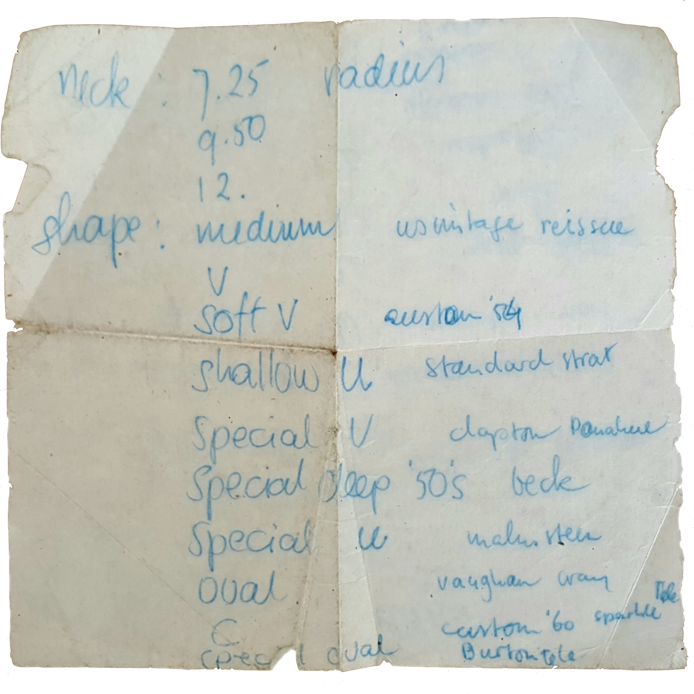 The neck was mainly a point that I had to take into account. That is why I had written down all kinds of neck profiles from fender brochures. To always have that piece of paper at hand, I kept it in my wallet. One morning (in 2019) I discovered that that piece of paper was still in my wallet and that I have been carrying it with me for 25 years.