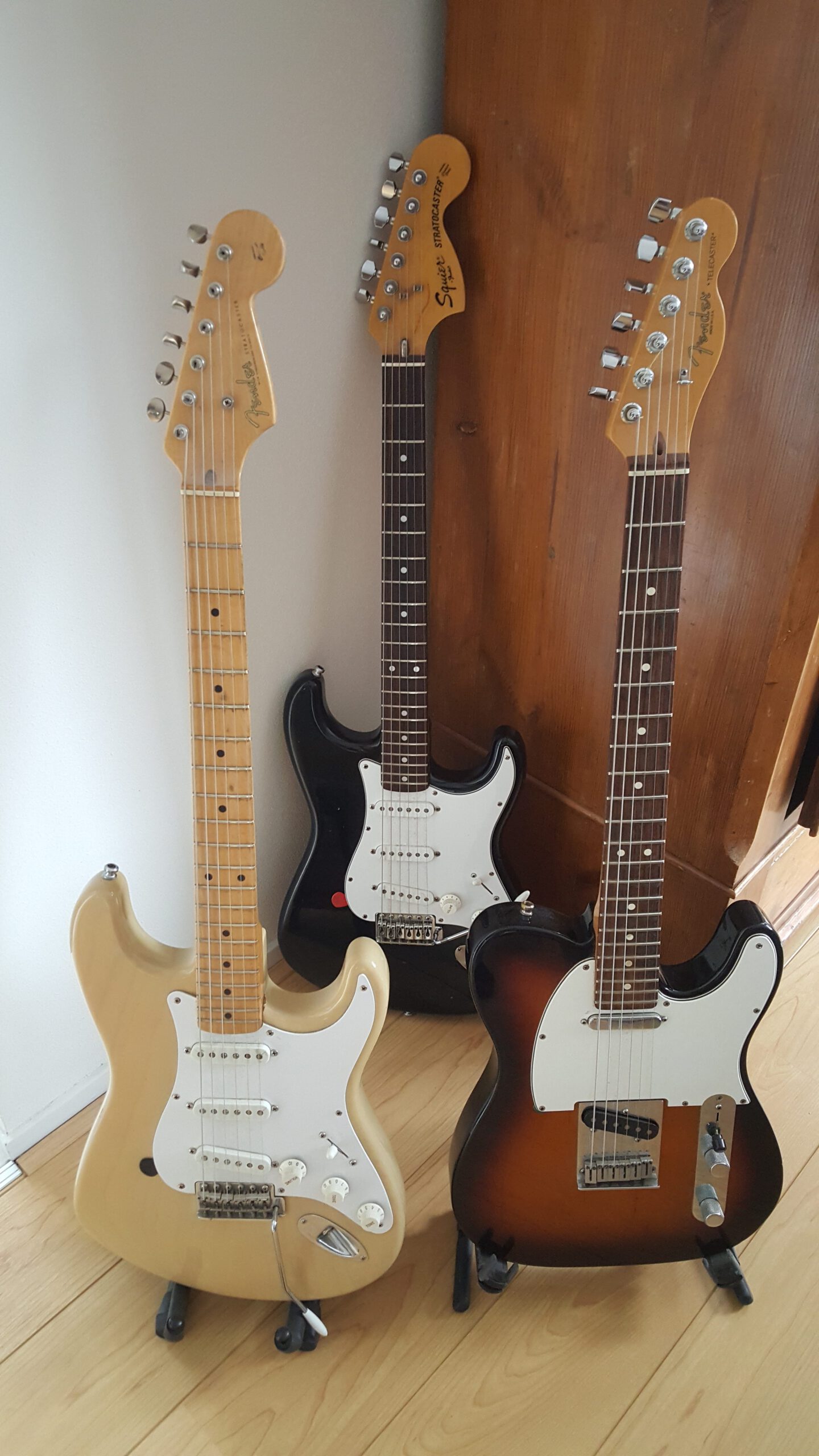 Lately I have been playing on a Fender Squier 70s Reissue from 1983 (made in Japan, but with American parts) and that works well. I leave my 54s Reissue Strat (1995) on the stand for that. The 54-er originally has a rock maple neck with a V-profile and thin frets. I didn't like playing: the strings felt tight and stiff, the neck stiff. I had the neck replaced at Rikkers. I wanted one like the one on the Fender Squier. It also had a Godin Ibanez-like neck with a rosewood fretboard and jumbo frets. Quite different from the Squier, which I initially wanted, but I enjoyed playing on it for over 10 years. Which again shows that the factors that make a guitar enjoyable are not easy to determine.